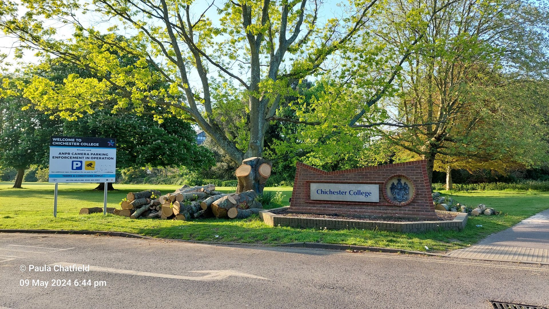 Red oak behind the Chichester College brick sign, just to the right, here on Google streetview in September 2023 and photographed 9th May 2024.