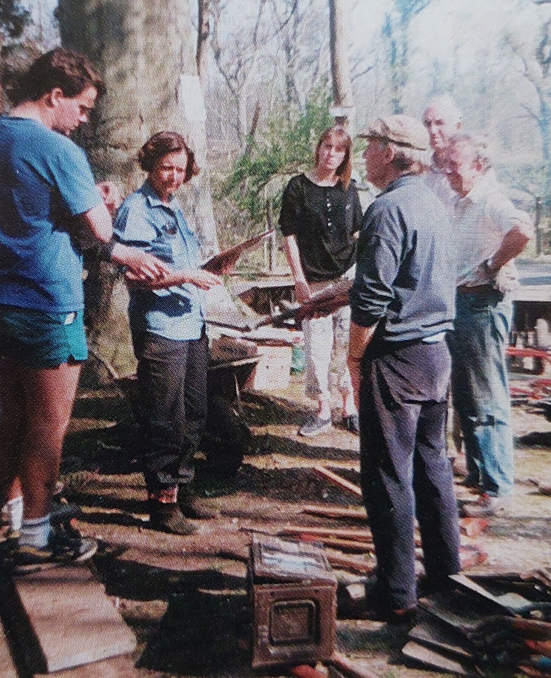 Top, fence building 1990; above right, ready for work 1993; above, snow 1996; right, smiles after the 2000 pond dredging.