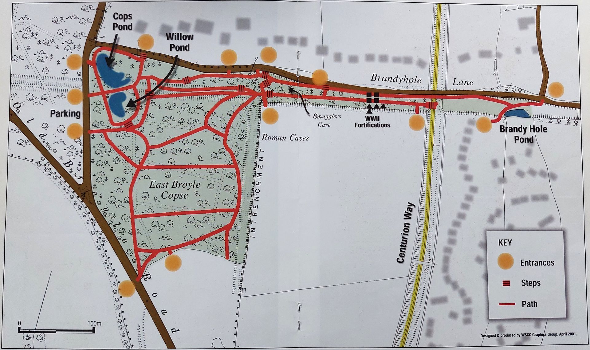 The back cover of the publication comprises the map pictured below followed by an invitation to support conservation work at the Copse through subscription to what is now the Friends of Brandy Hole Copse and the names, addresses and 'phone numbers of the Secretary (Jim Ayling) and Chairman (John Herniman). The text is partially obscured by blue tape on the Library copy, and it seems inappropriate to reproduce historic contact details here.