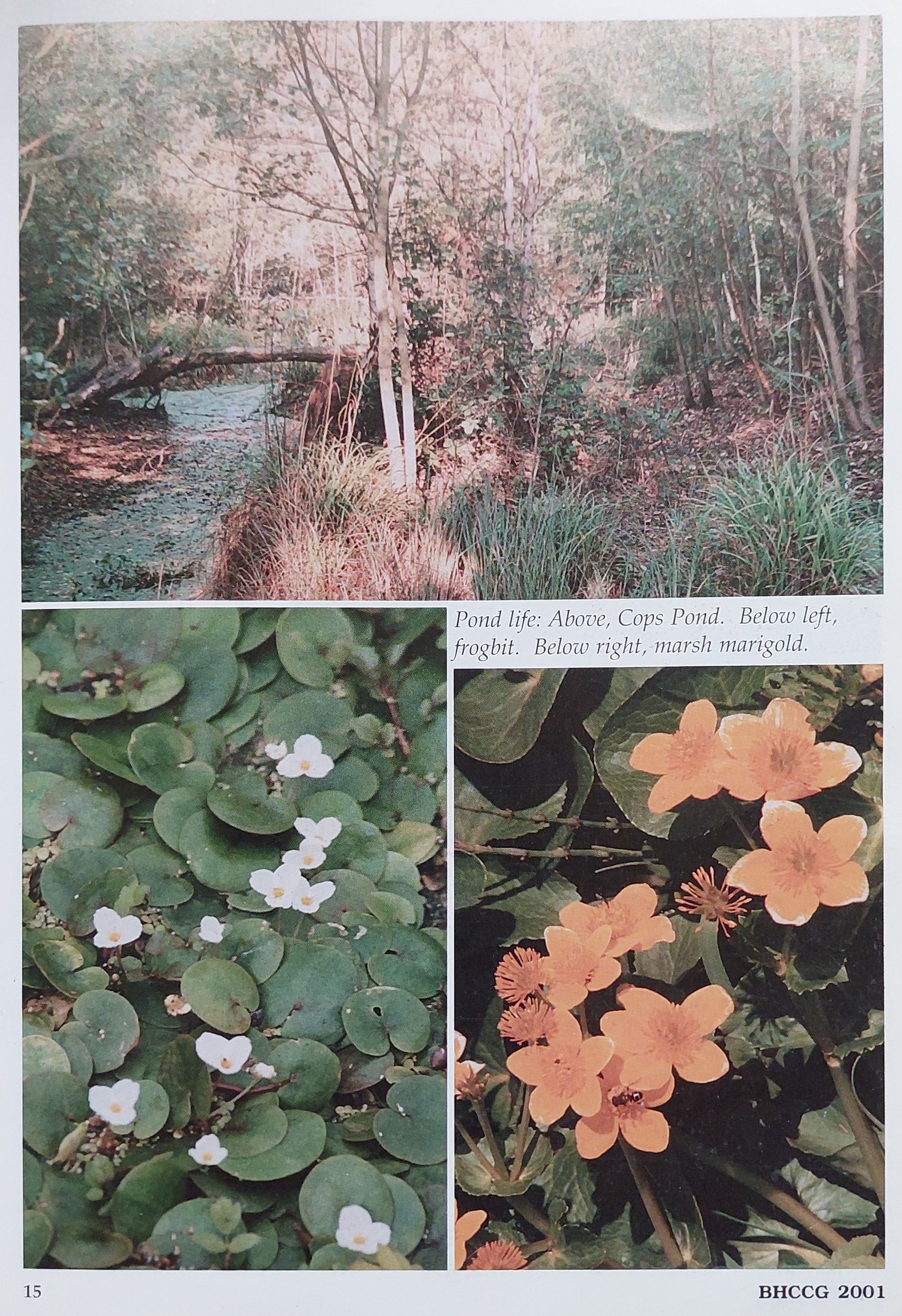 Pond life: Above, Cops Pond. Below left, frogbit. Below right, marsh marigold.